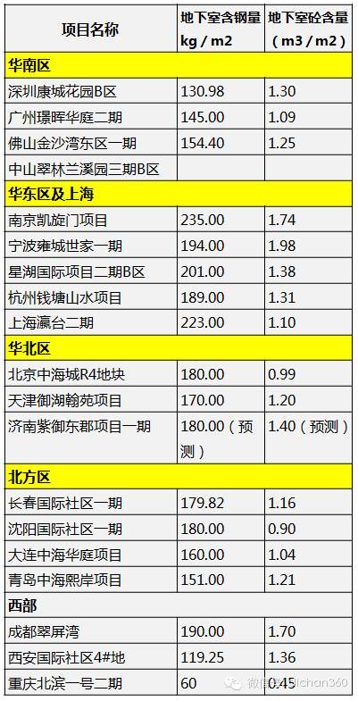 具体地体现上钢筋和砼的用量指标上,这一点极其关键!是地下室建造成本控制的核心!。目前的水平是钢筋140-200kg/m2,甚至更多;砼是1.0m3/m2以上,影响砼用量的是底板厚度。有500mm厚的,也有1000mm厚的。当然跟层数也有关系,层数多,摊销下来的指标就很底。想说明的是,我们在08年8月底下发的《限额审批意见》中对于钢筋与砼指标含量没有提出具体的限额数据,原因是全国各个地区的抗震等级、地质条件、人防要求等很多因素不一致,但应该来说在同一个区域相对有一定的规律,或者说研究起来更有指导意义,文中提出请各个区域来进行研究并细化具体指标。以下列出目前在建的一些项目的指标含量,可大概看出一个区间: