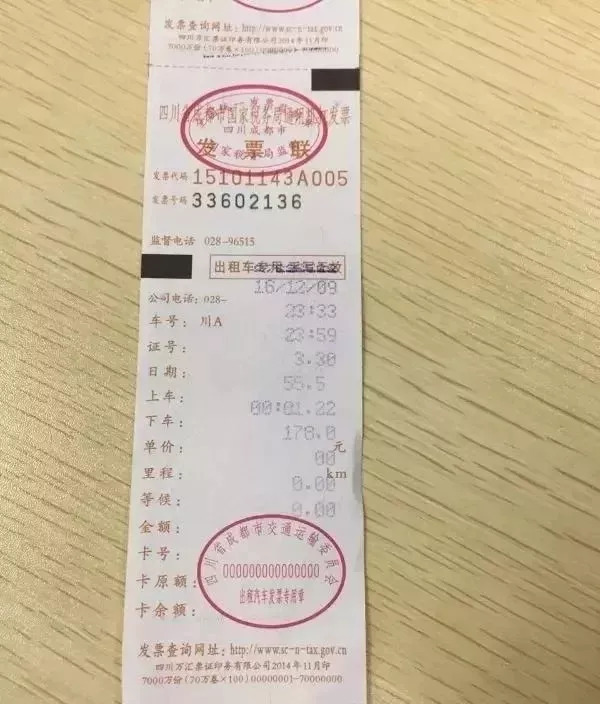 出租车发票其实在四川看发票抬头也是通用机打发票卷式,样式更长,适合行业需要,从领用单位来看,可以看出这是一张出租车发票。