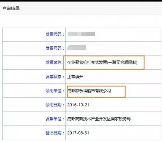 冠名发票其实也就是通用机打发票,只不过冠上了企业的名称,比如这张查验发票的结果就是家乐福超市的冠名发票。