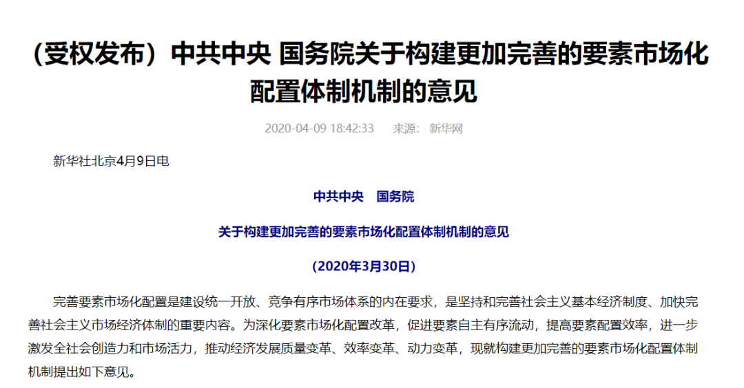 出了一份文件《中共中央、国务院关于构建更加完善的要素市场化配置体制机制的意见》。